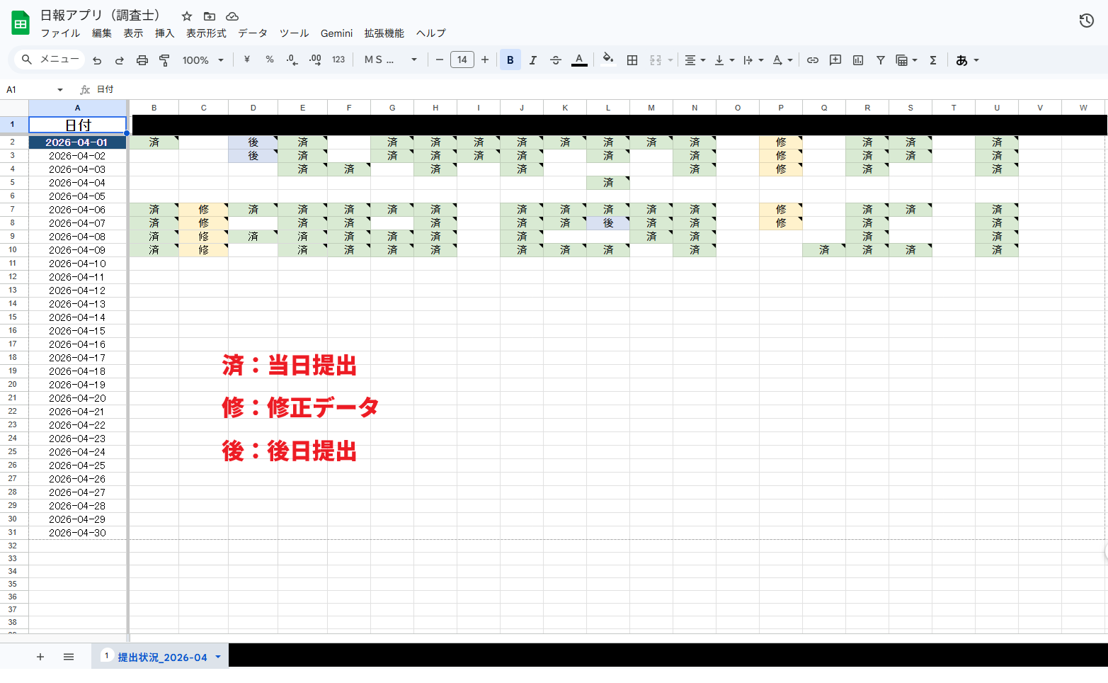 実際の運用が始まると、スプレッドシートに日々のデータがどんどん積み上がります。