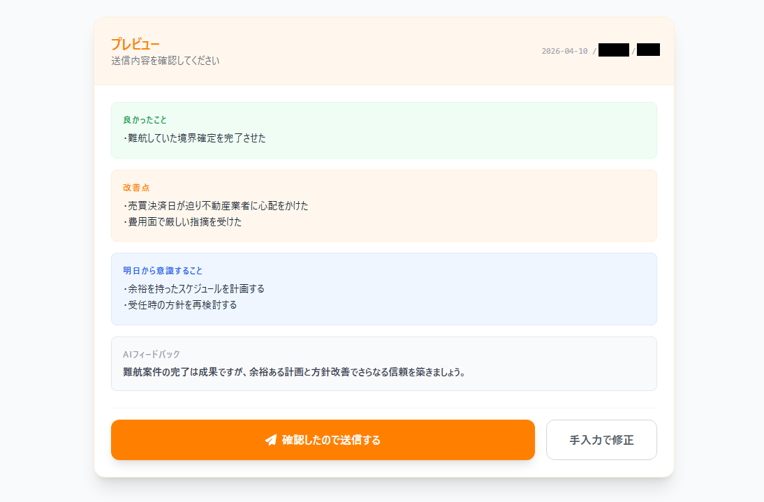 これをAIが瞬時に以下のように整え、自動でフィードバックまで添えてくれます。