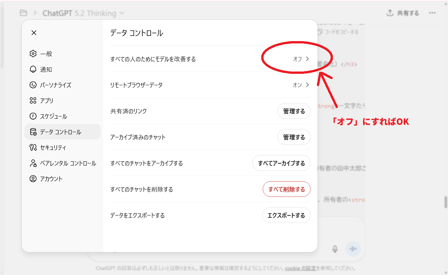 - 無料版・個人有料版(Plus)を使うなら:今すぐ設定画面(設定 > データコントロール)を開き、「すべての人のためにモデルを改善する」をOFFにする。そして、「個人情報は一文字も入れない」ことを意識して利用する。