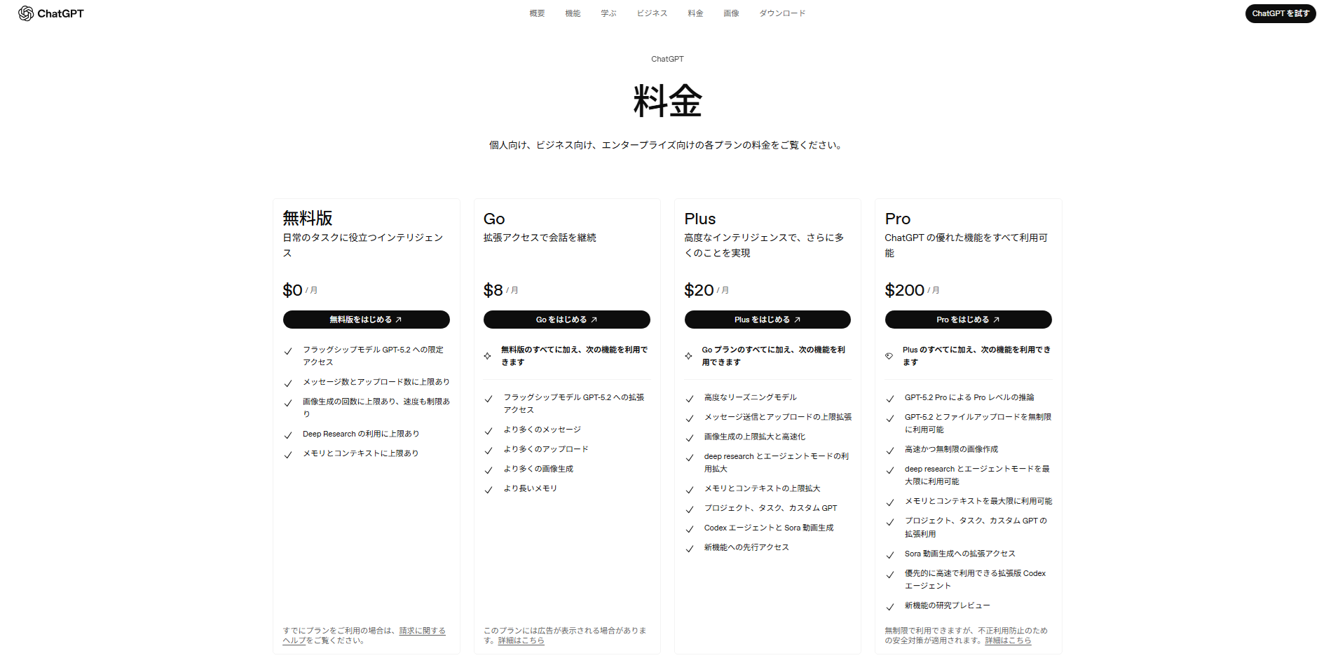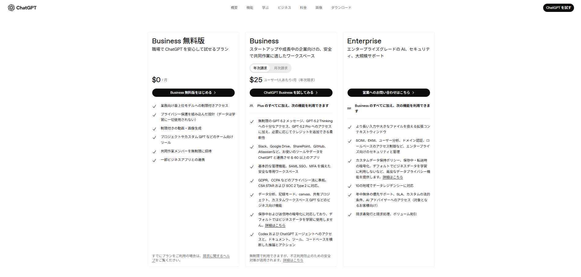 現在、ChatGPTの料金ページには、「無料版」や「Business無料版」が提示されています。「ビジネス用としても無料版が使えるなら、それで十分では?」と思われるかもしれません。