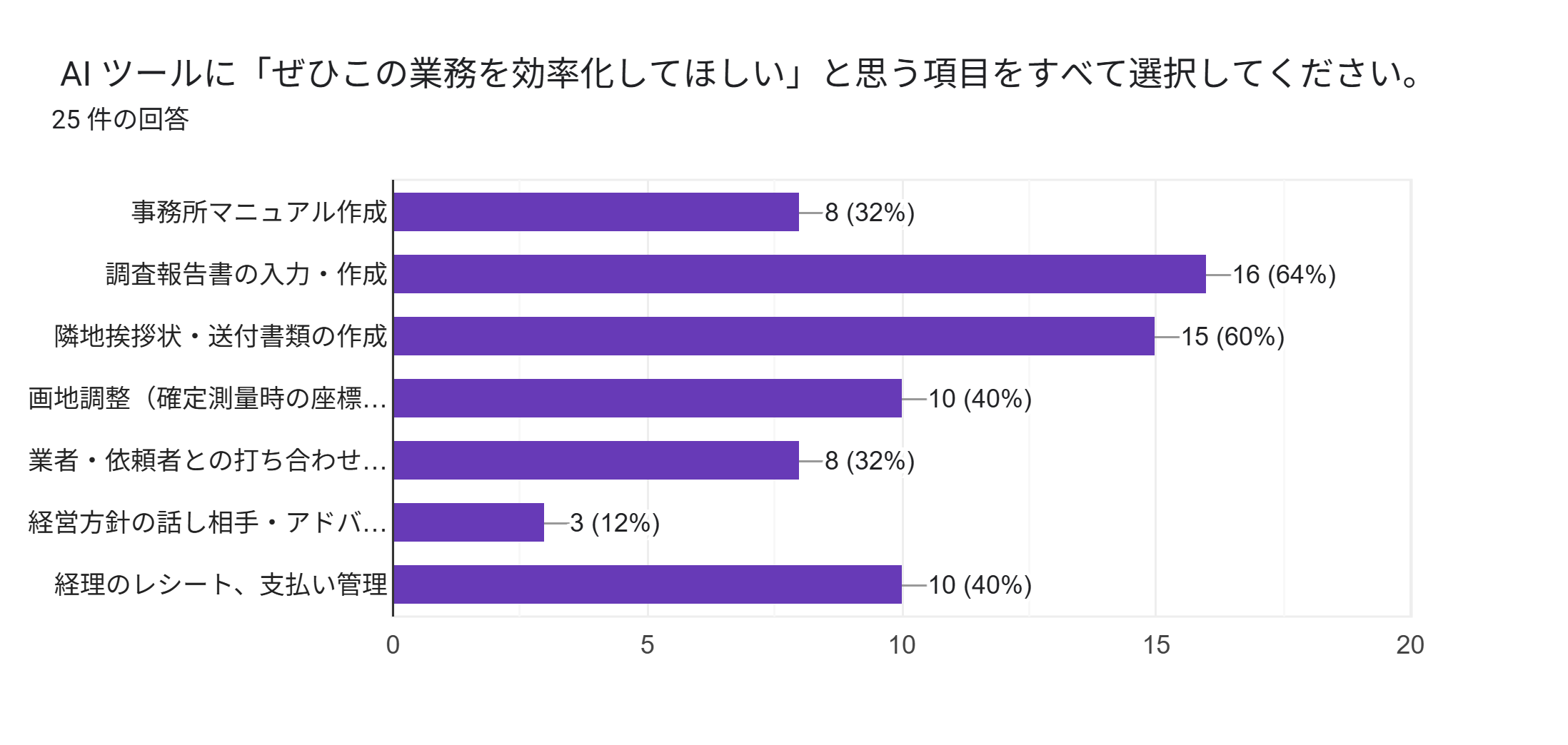 ここからも、土地家屋調査士業務においてAIへの期待が高いのは、現場作業そのものよりも、入力・整理・文章化・記録化といった事務作業であることが見えてきます。